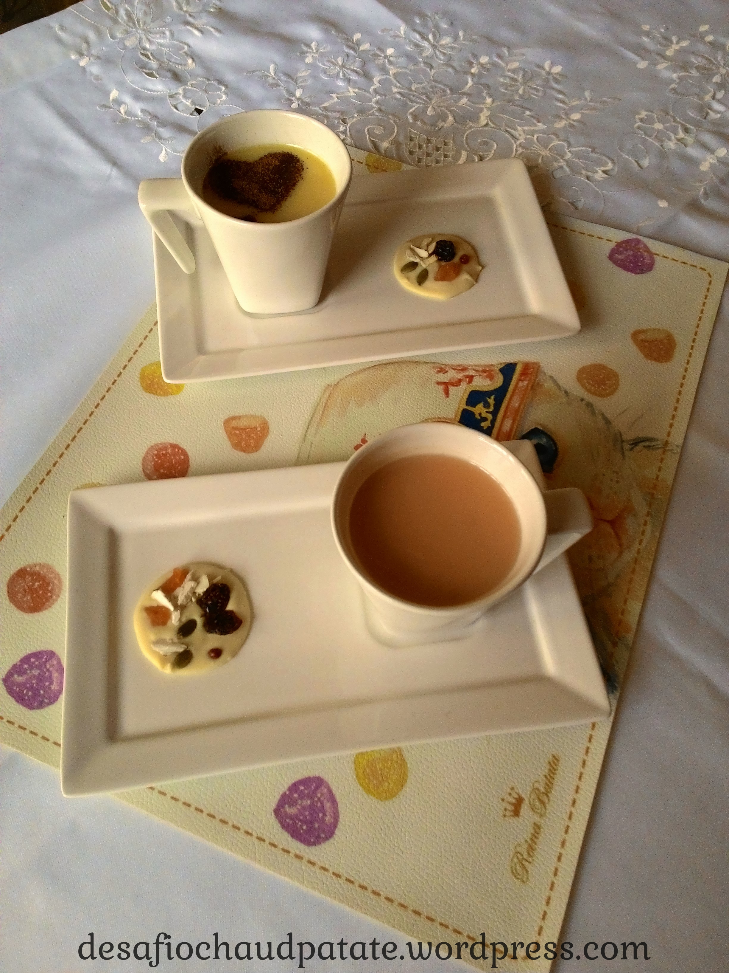 Chocolate branco quente aromatizado Chocolat blanc chaud aux arômes de vanille ou liqueur à la fraise