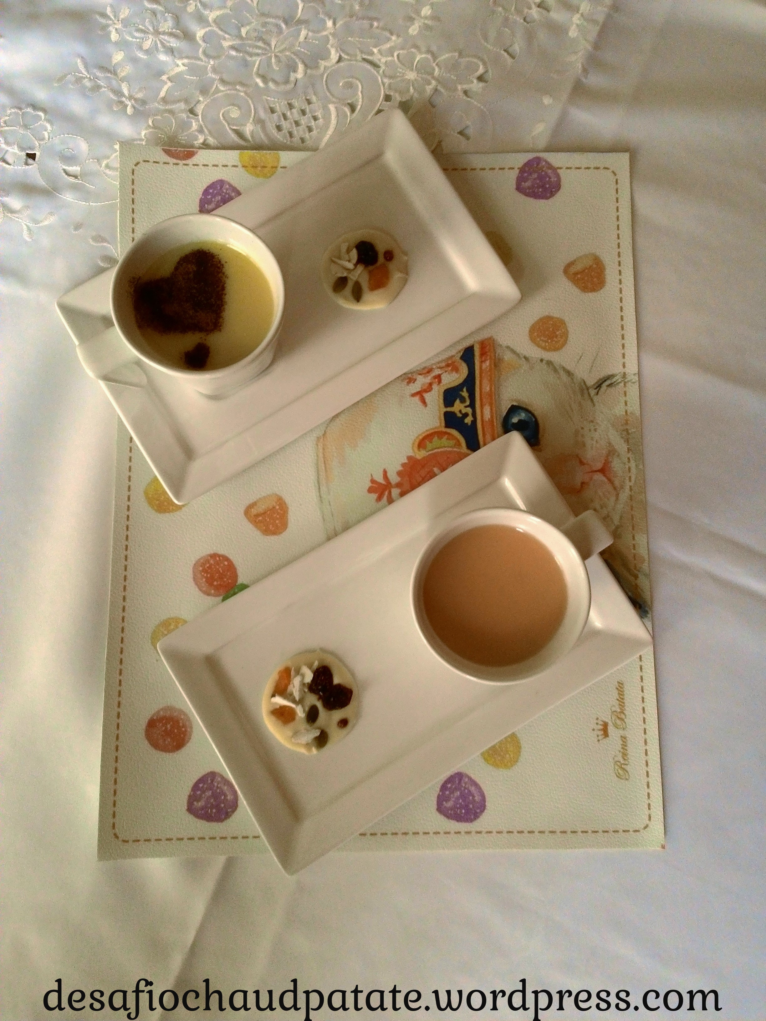 Chocolate branco quente aromatizado Chocolat blanc chaud aux arômes de vanille ou liqueur à la fraise