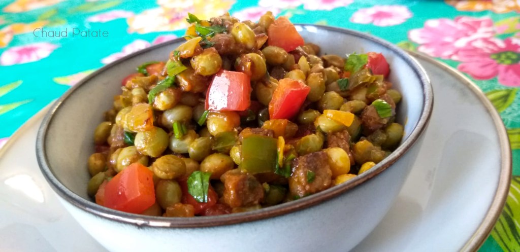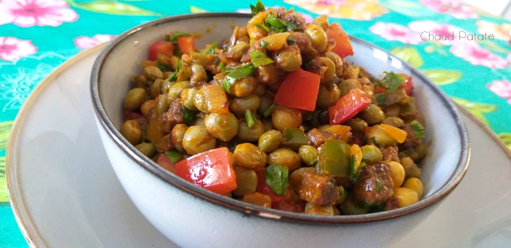 Vous allez trouver ici « le mirepoix nordestin », la base de saveur qu’on utilise dans nos plats au Nord-est du Brésil : oignon, poivron vert, tomate et piment végétalien que j’ai remplacé ici par un piment en conserve. À côté de ça vient une pâte d’ail et graines fraîches de coriandre écrasés au sel, mais comme il est impossible de trouver ces graines en France métropolitaine au moins, on le remplace par les feuilles de coriandre à la fin de la recette. Et pour les épices, pas de haricot/pois au Brésil sans cumin ! Un peu de paprika et de curcuma, de la pulpe de tomate pour l’umami et le tour est joué. En espérant que ça vous ouvre l’appétit, je vous invite à voyager au sertão de Bahia avec moi.
