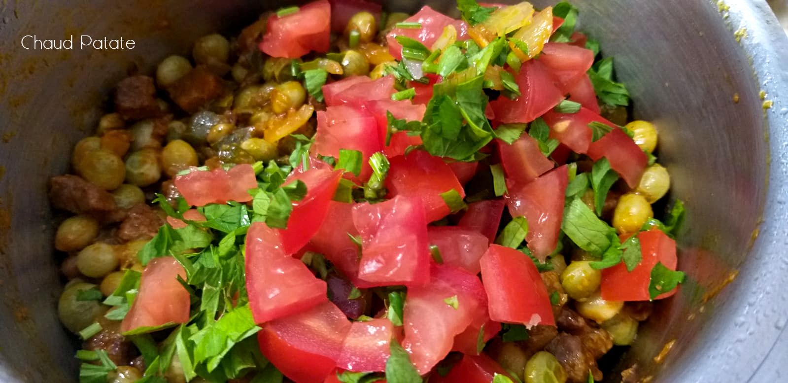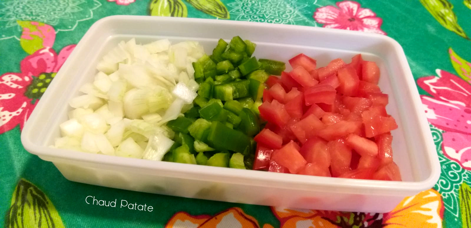 Pendant que le pois cuise, coupez en brunoise l’oignon, le poivron, la tomate et le piment végétalien si vous en disposez. A part, ciselez les herbes fraîches. Coupez en petits dés la viande séchée. Écrasez les gousses d’ail et faites la mise en place des épices et assaisonnements.