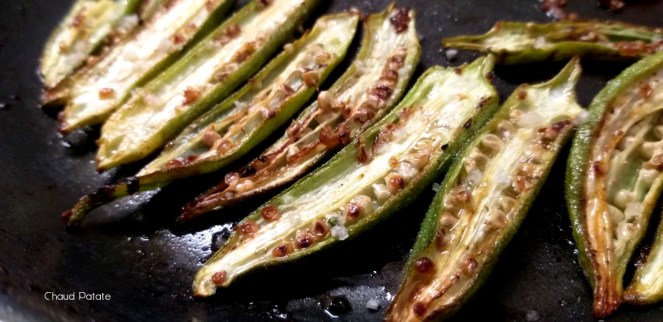 Na mesma frigideira onde o porco foi selado, em um fio de azeite grelhe os quiabos cortados ao meio (no sentido do comprimento). Cinco minutos de um lado mais três minutos do outro são suficientes para deixá-los cozidos e douradinhos. Tempere com uma pitada de sal e reserve.