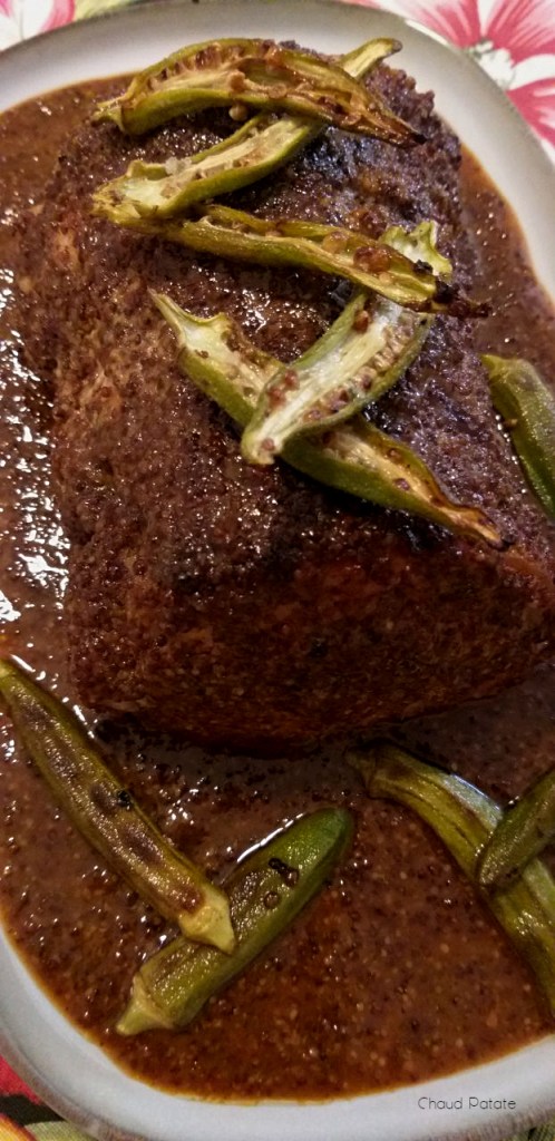 Com as temperaturas começando a cair aqui na França, é hora de privilegiar receitas práticas que vão ao forno e aproveitar para, além de comer bem, aquecer o ambiente. O almoço de domingo foi um filé suíno rosadinho acompanhado de um molho de mostarda e mel encorpado feito com os sucos do cozimento da carne, a marinada da véspera e um toque de tapioca granulada (que pode ser substituída por polvilho doce). Para completar, quiabos grelhados que combinam perfeitamente com abóboras em todas as suas formas. Pensando nesse casamento, não deixe de voltar ao blog na sexta-feira (05/11) para descobrir uma saladinha de abóbora crua que é de comer com os olhos!