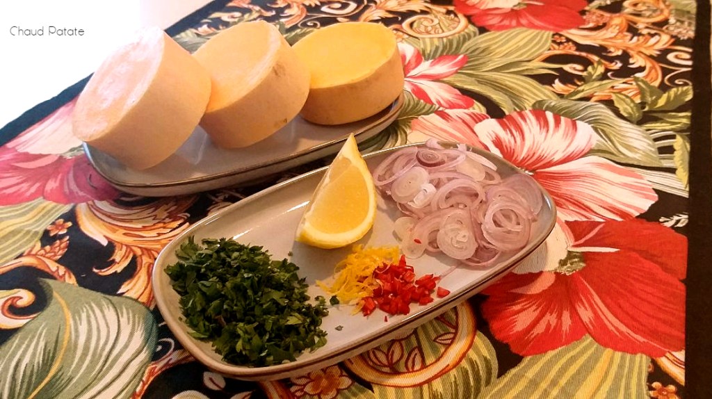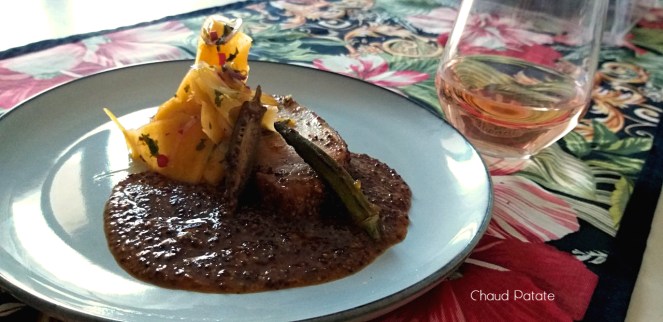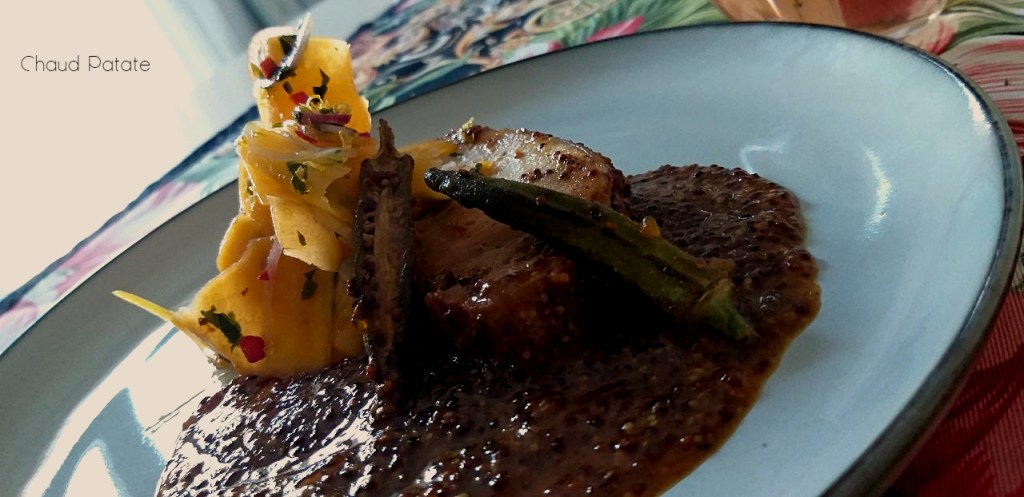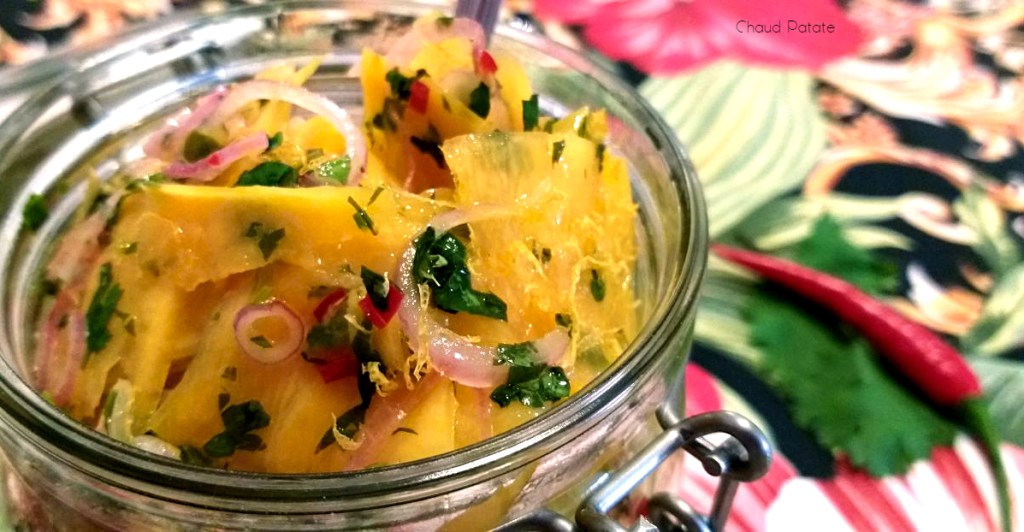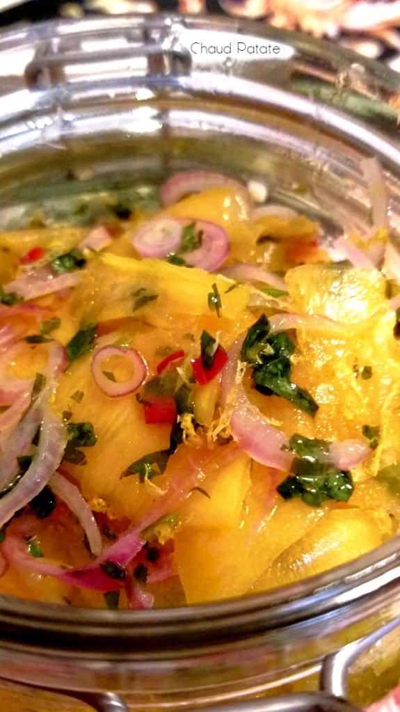 Cette salade citronnée et fraîche se marie très bien avec une recette que j’ai publiée lundi : le mignon de porc en croûte de moutarde et miel avec des gombos rôtis. L’assiette oscille entre le brun et le jaune orangé dans une composition automnale pas inintéressante. L’onctuosité de la sauce, l’acidité de l’accompagnement et la texture de la viande ont su nous régaler à la maison.