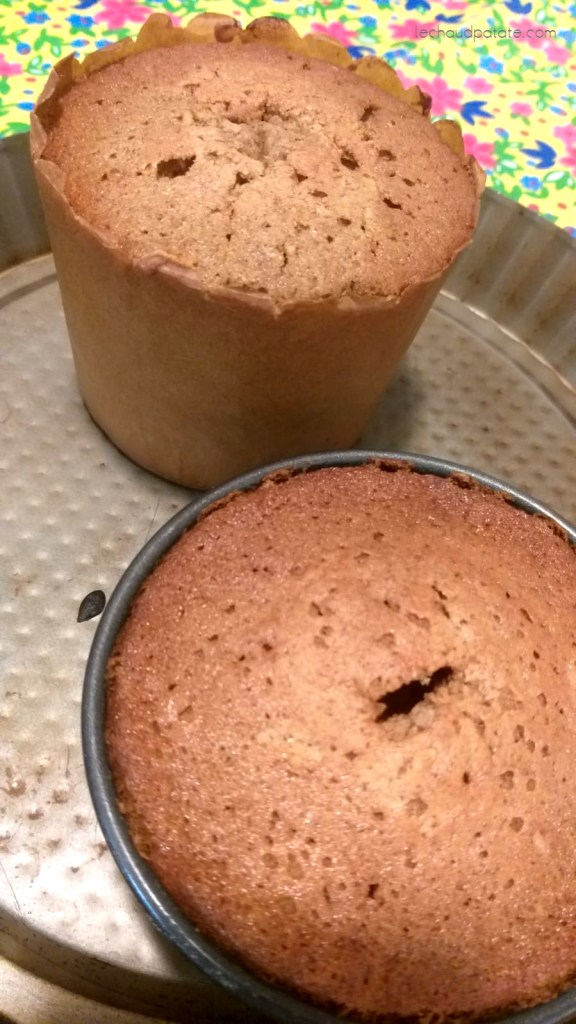Faites cuire le gâteau à 180 C de 35 à 40 minutes. N’oubliez pas de chemiser votre moule. Sinon, vous pouvez utiliser des moules en papier (celles qu’on utilise pour les panettones) qui décollent facilement après la cuisson.