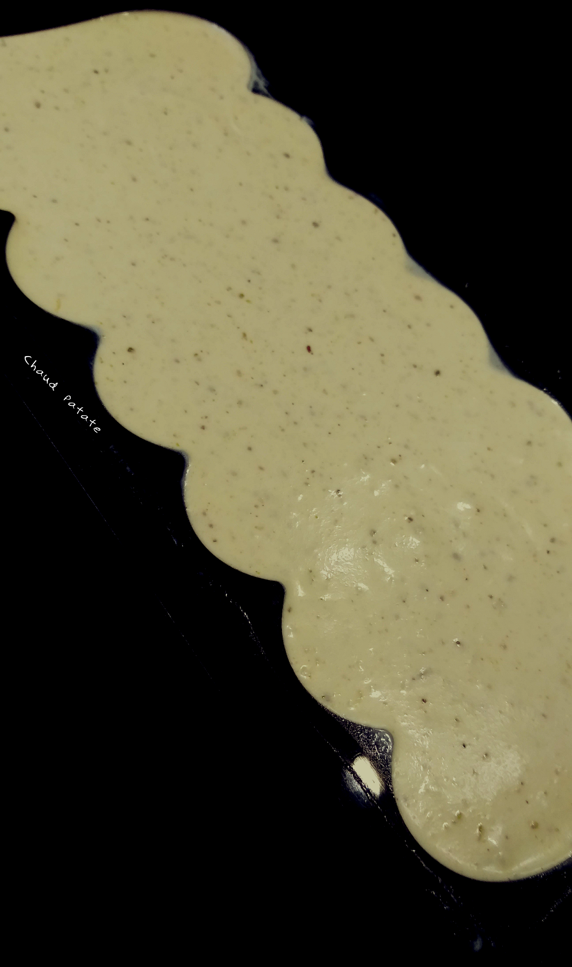 Versez cet appareil directement dans une moule de silicone rectangulaire ou dans une moule d’autre matériel mais dans ce cas couvrez-la avec du film alimentaire pour faciliter le démoulage. Déposez le moule au congélateur pour que le crémeux prenne. Pendant ce temps, passez à la deuxième étape de la recette.