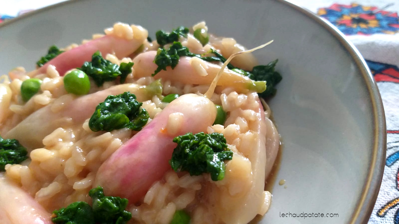 Avec cette recette je participe au jeu Foodista Challenge, ce défi culinaire mensuel qui réunit depuis quelques années des passionnés de cuisine, blogueurs ou non, autour d’un thème proposé par un.e nouvel.le parrain/marraine à chaque fois et en respectant au moins deux contraintes. Pour cette édition 87 c’est notre chère Viviane du blog Quoi qu’on mange qui guide la troupe et j’espère que mon assiette lui plaise. Chalereuse et généreuse comme d’hab, elle nous propose pour thème le risotto, généreux et tellement gourmand ! : « Ce plat nourrissant à la portée de tous qui réchauffe le cœur est l’occasion de profiter de la famille et des amis, personne ne refuse l’invitation à manger une assiette de risotto qui peut se transformer en mets raffiné, d’autant que l’imagination permet de combiner une multitude d’ingrédients, légumes, herbes, viandes et poissons, fruits de mer, fromage, fleurs, fruits… » Comme contrainte elle nous a demandé de représenter le printemps avec la couleur verte, l’opportunité qu’il fallait pour incorporer les fanes des radis à la recette dans une démarche saisonnière, fraîche et 100% antigaspillage.
