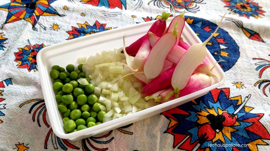 Faites la mise en place pour le risotto. Pour cela, écossez les petits pois, coupez l’oignon en brunoise et les radis en moitiés.