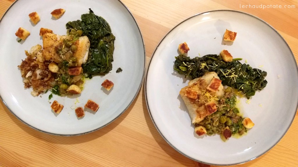 Pour accompagner le poisson j’ai juste sué un peu d’oignons blancs râpés (environ 1 cuillère à café bombée) dans l’huile d’olive (1 cuillère à soupe) et j’en ai saisi quelques feuilles d’épinard (environ 150 g), le tout déglacé avec le jus de citron jaune dégagé lors du taillage du fruit. C’est très intéressant, on dirait de l’oseille !