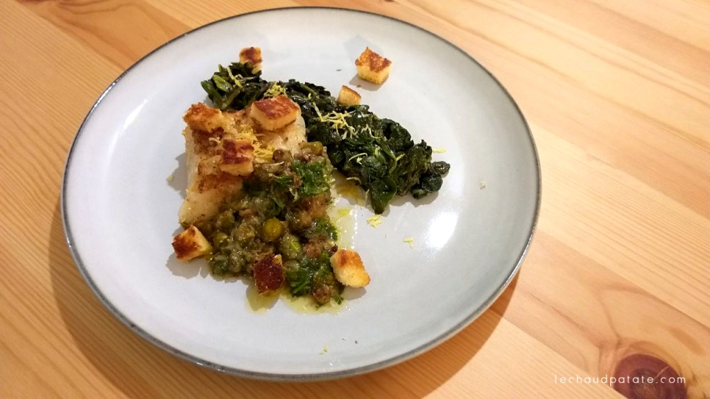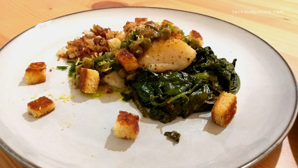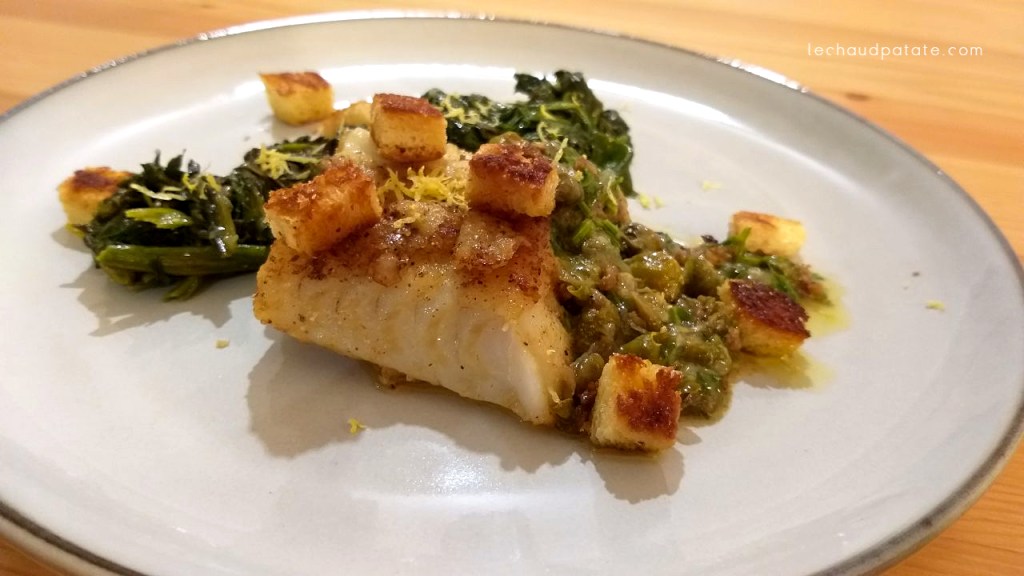 D’abord, récupérez les zestes du citron avant de le peler à vif pour en extraire les suprêmes. Taillez ces suprêmes en petits cubes et réservez. Effeuillez et ciselez le persil. Égouttez les câpres. Dans la même poêle de cuisson du poisson faites fondre et cuire un peu plus de beurre jusqu’à qu’elle devienne noisette. Déglacez avec un peu de jus de citron. Cela permet de récupérer les morceaux de poisson cassés qui sont caramélisés et pleins de saveur – même si ce n’est pas très joli au dressage, c’est quand même une couche de saveur de plus ! Ensuite, ôtez le feu et incorporez au beurre chaud les segments de citron et les câpres. Au moment de servir, mélangez les zestes de citron et le persil, ils sont essentiels pour apporter de la fraicheur à ce plat bien gras. Et n’oubliez pas de distribuer quelques croutons dans l’assiette au moment du dressage.