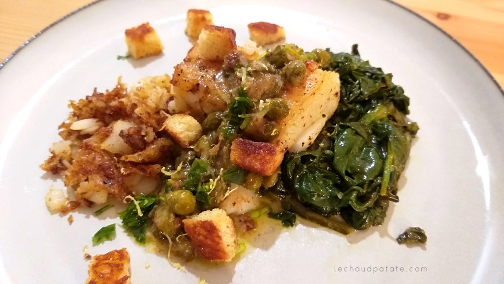 Aujourd’hui je partage avec vous un condiment plein de pep’s pour accompagner vos poissons blancs et pour donner du caractère au repas. Il s’agit d’une variation de la sauce meunière, où le poisson blanc est cuit dans une belle quantité de beurre noisette et assaisonné de jus de citron. Ici, la version grenobloise incorpore aussi des câpres, du persil et des croutons à l’assiette. Pour ce genre de préparation je ne suis pas sûre qu’il existe une bonne mesure universelle, les dosages varient à partir de chaque palais. Ce qu’on cherche c’est l’équilibre entre l’acidité du citron, le salé des câpres, le croquant des croutons, la rondeur du beurre et la fraicheur des herbes (et des zestes de citron qui changent tout!). Je ne saurais pas vous dire la bonne quantité de chaque ingrédient cette fois-ci car c’est une recette « à l’oeil » comme on dit. La cuisine n’est pas une science exacte, ça se fait aussi au feeling et j’ai décidé de partager le savoir faire, le modus operandi, mais à vous de doser conforme à vos envies. Goutez, rectifiez, amusez-vous !