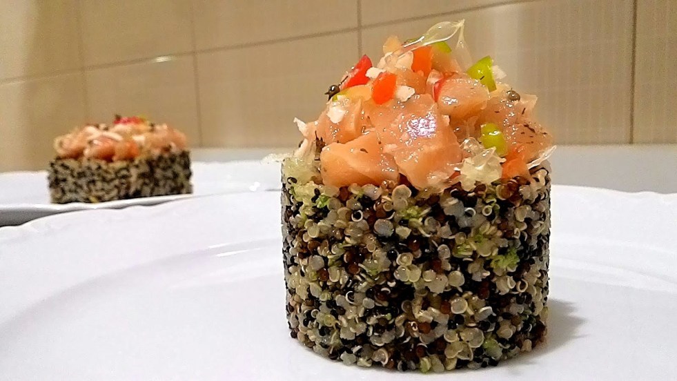 Quinoa multicoloré et saumon fumé à froid aux saveurs d’ailleurs / Mix de quinoa e salmão curado com azeite de licuri e pimenta de cheiro