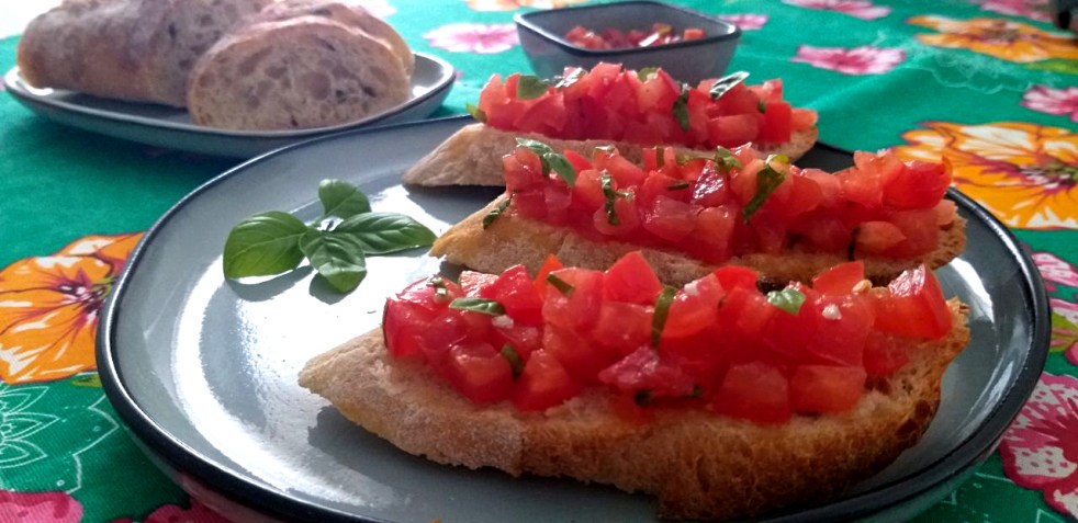 Bruschetta tomate et basilic 2 tomates moyennes quelques feuilles de basilic 1 bonne cuillère à soupe de huile d’olive sel et poivre des baguettes nature et aux olives 1 gousse d’ail Pour la mise en placce, ôtez les péduncules et les pépins des tomates (ces derniers peuvent être incorporés dans une autre recette, jamais à… Lire la suite Bruschetta tomate basilic